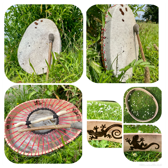 De grootte, houtsoort, dikte en vorm van het frame en de soort, dikte, beharing en bewerking van de huid en de drumstok bepalen de uiteindelijke klank en energie van jouw eigen unieke persoonlijke drum. De kracht en energie uit het leven van de boom en het dier krijgen een tweede leven, een nieuwe stem. De klank van een natuurvel met haar is warm en blijft interessant door de invloed van de continu veranderende omgevingstemperatuur en vochtgehalte van de lucht. De klank van een vel zonder haar is wat stabieler en bevat meer boventonen. Na het opspannen van de natte huid heeft je drum tijd nodig om te drogen zodat de oerklanken volledig tot z'n recht komen.